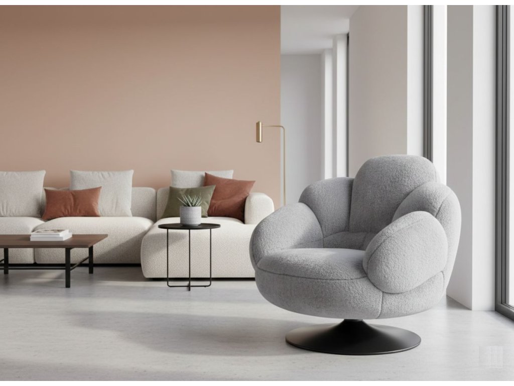 Dopřejte si odpočinek v křesle, které působí jako měkký designový solitér. Relaxační otočné křeslo „Cocoon Plush“ s otočným sedadlem v rozsahu 360° je stvořeno pro pomalá rána, čtení i večerní relax. Šedé sedátko z hebké plyšové tkaniny vytváří útulný, luxusní dojem a díky „objímajícím“ tvarům poskytuje příjemnou oporu. Černá kovová konstrukce s práškovou povrchovou úpravou přidává moderní kontrast, stabilitu a vizuální lehkost, takže křeslo krásně vynikne také v čistém, minimalistickém prostoru.
