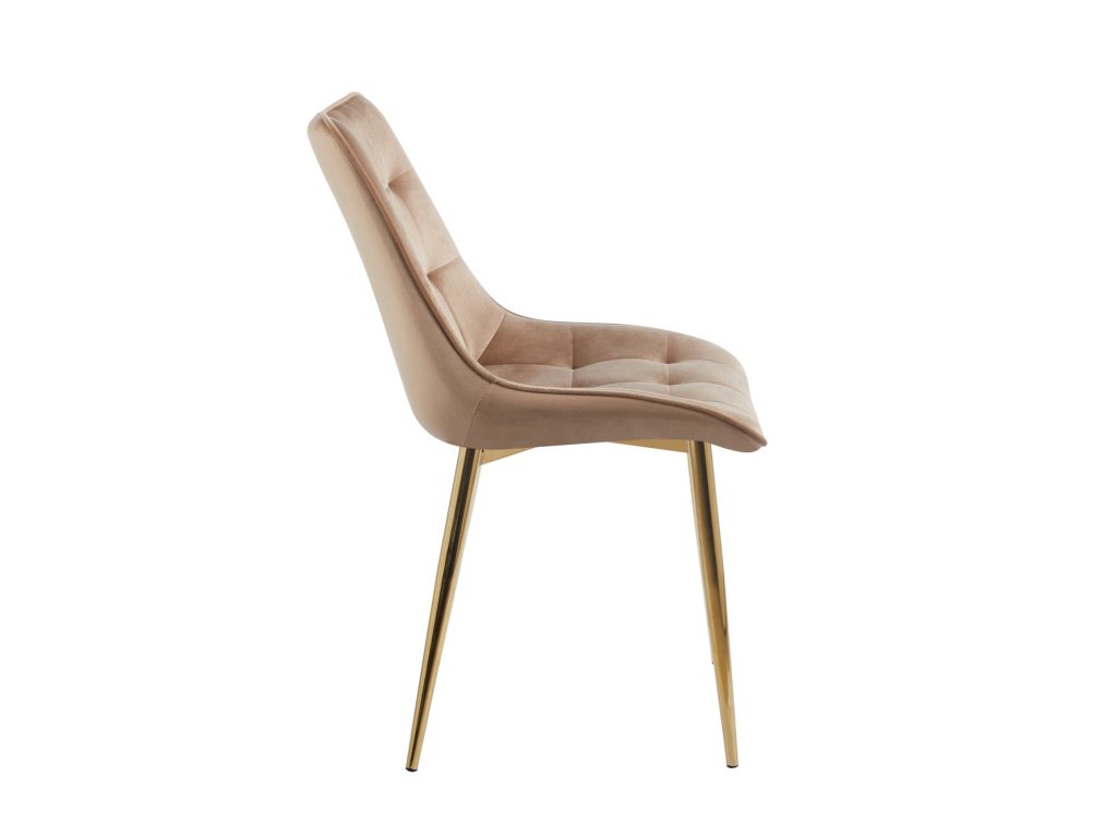 Zlaté kovové nohy jsou stabilní, pevné a zároveň tvoří výrazný dekorativní prvek, který pozvedne design celé místnosti. Elegantní prošívání sedáku dodává židli exkluzivní vzhled a zvýrazňuje kvalitu zpracování.