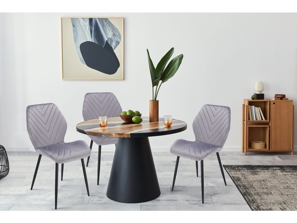 Sametové čalounění z velurové látky s jemným prošíváním ve vzoru rybí kosti působí mimořádně jemně a vysoké a štíhlé nohy v černé barvě dodávají celé konstrukci dojem vizuální lehkosti a zároveň zaručují dokonalou stabilitu.