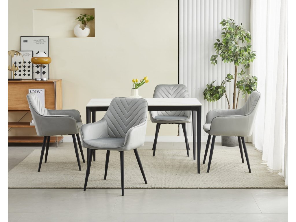 Židle NANA dokonale doplňuje moderní jídelny a kuchyně, kde se kombinuje s bílými nebo tmavými stoly. Stříbrno-šedý samet harmonizuje s kovovými doplňky a dodá interiéru nádech elegance. Ideální pro ty, kteří hledají spojení stylu s praktičností.