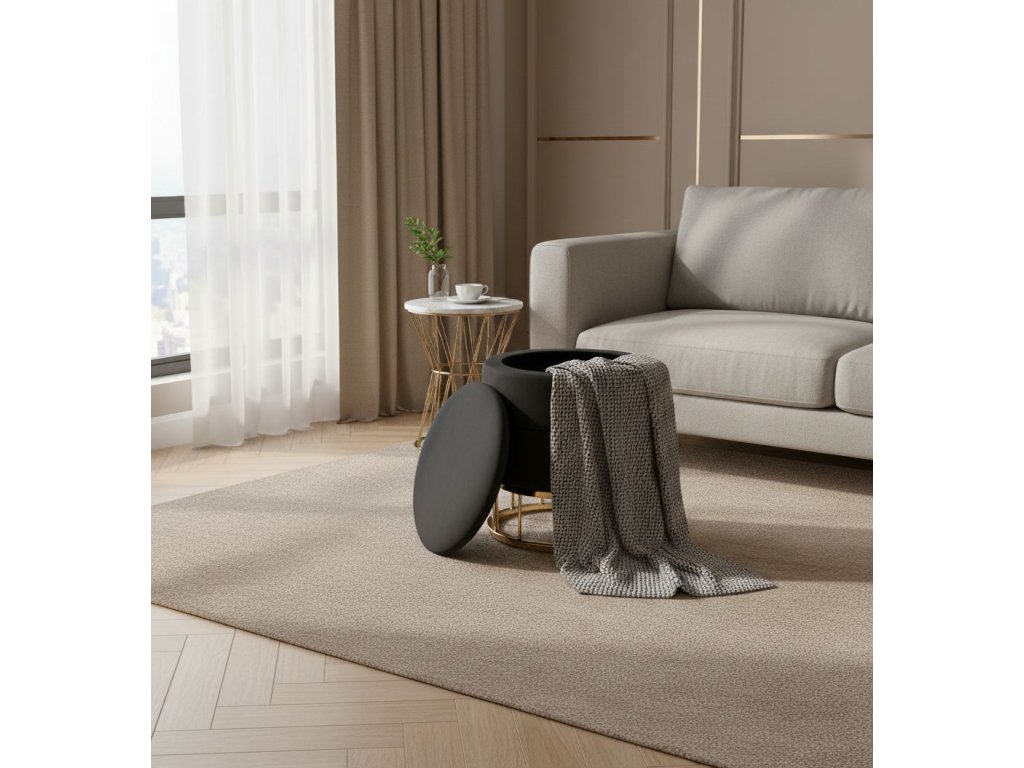Vnitřní úložný prostor poskytuje praktické řešení pro uložení drobností, dek, polštářů nebo časopisů, čímž pomáhá udržet prostor uklizený. Kulatý tvar a kompaktní rozměry dělají z taburetky ideální volbu i do menších místností, kde poslouží jako sezení, podnožka nebo dekorativní prvek.