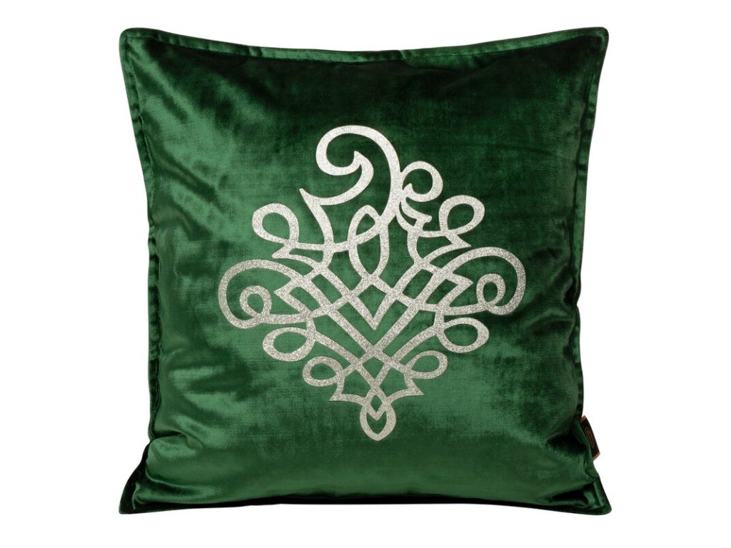 Dekorativní povlak na polštář z měkké sametové látky ozdobený stříbrnou ornamentovou aplikací.