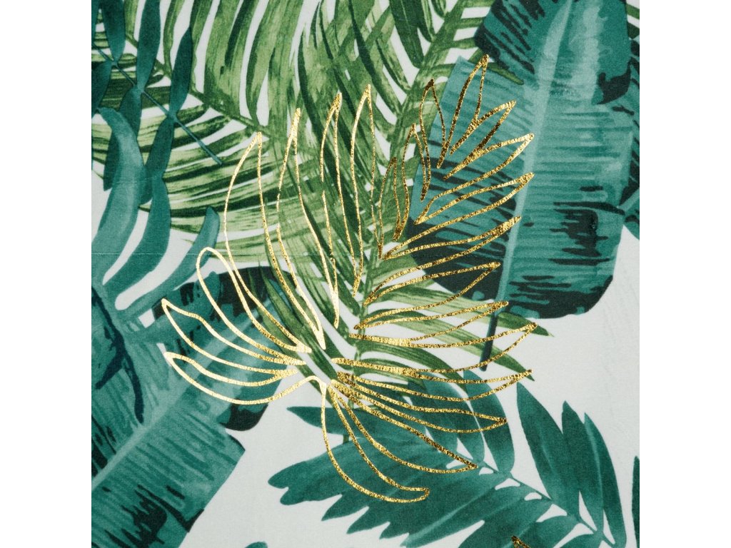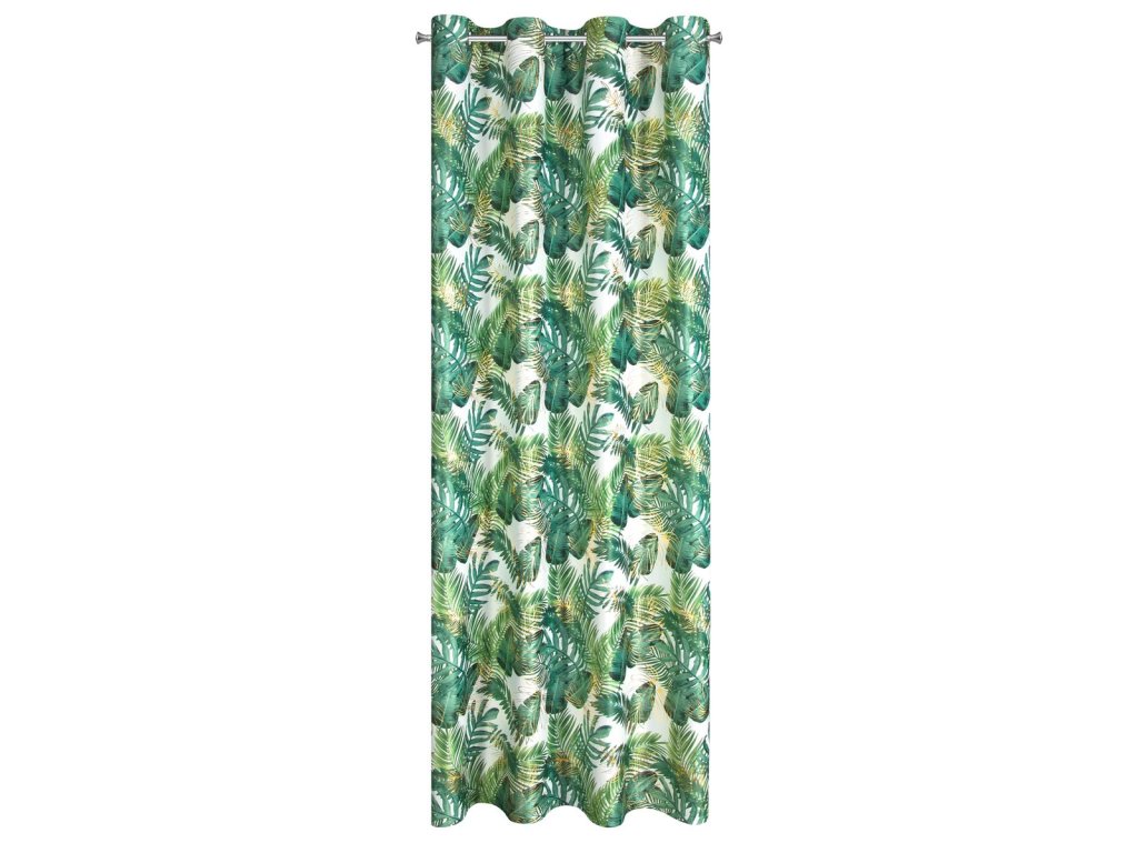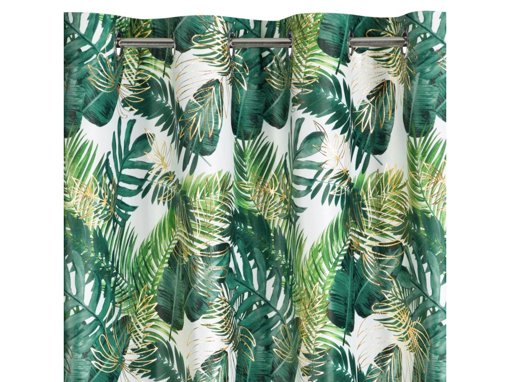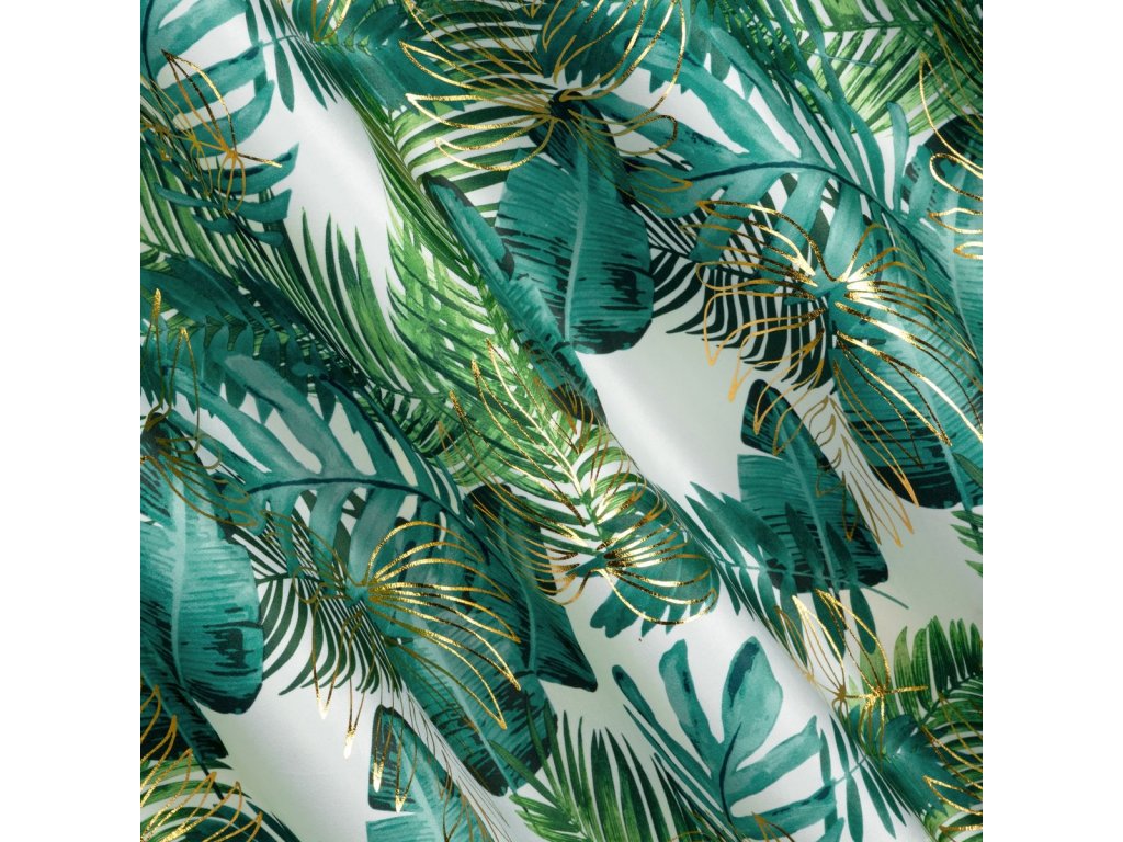 Na dotek jemný závěs z příjemné sametové látky, zdobený módním motivem exotických listů v intenzivních zelených a tyrkysových barvách se zlatými prvky, na bílém podkladu, je doplňkem, který se dokonale hodí do moderních interiérů.