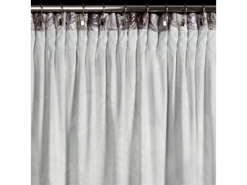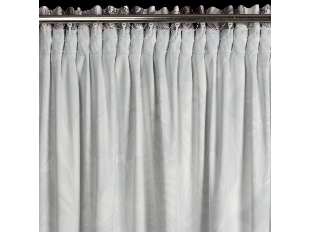 Závěs je vyhotoven na univerzální řasící pásce s funkcí tunelu, což jej umožňuje zavěsit pomocí žabek, háčků, případně převléknout na záclonovou tyč.