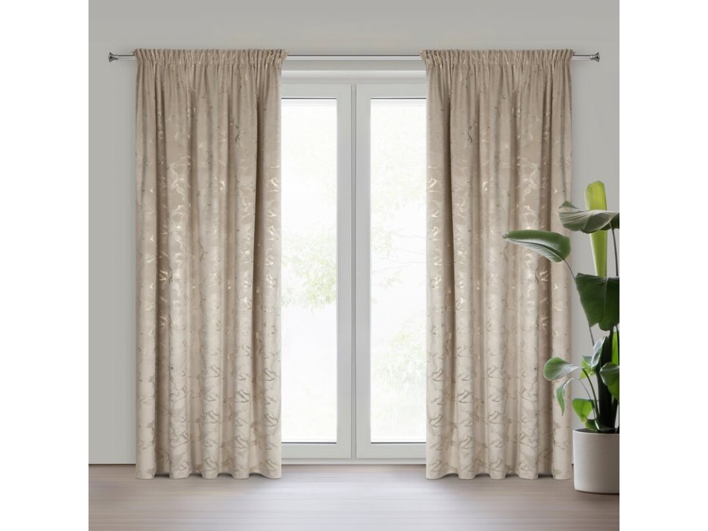 Hebký sametový materiál krásně splývá, jemně odráží světlo a vytváří bohatý efekt řasení, který zvýrazní výšku místnosti a dodá jí elegantní charakter. Béžová barva interiér opticky zjemňuje a vnáší do prostoru pocit klidu a rovnováhy.