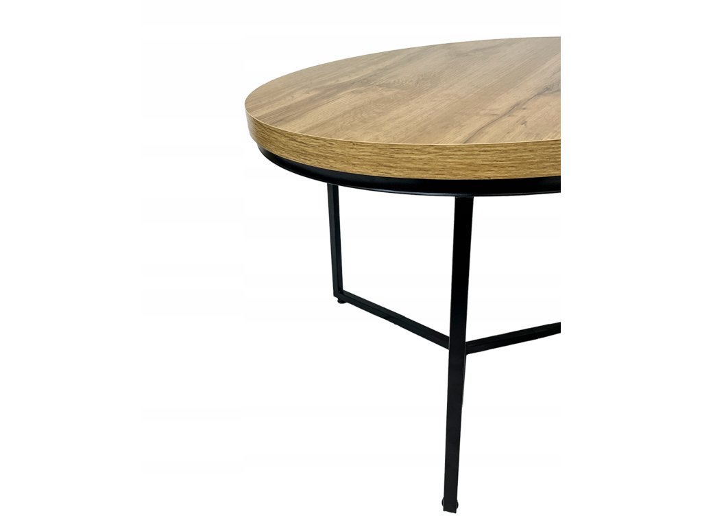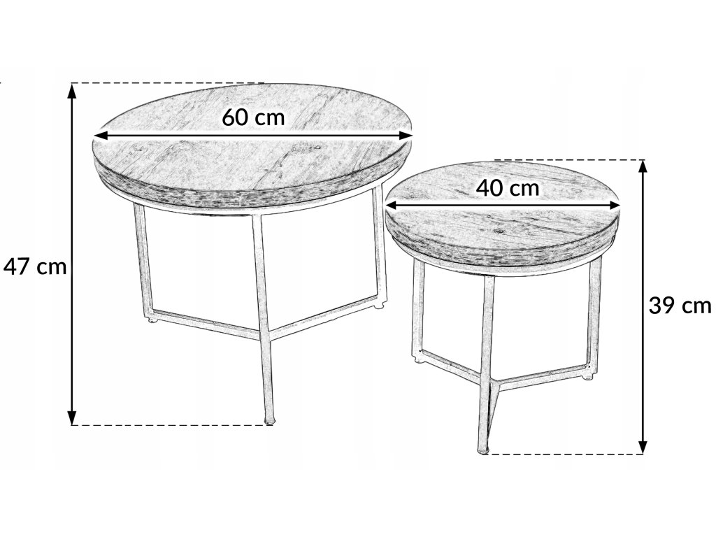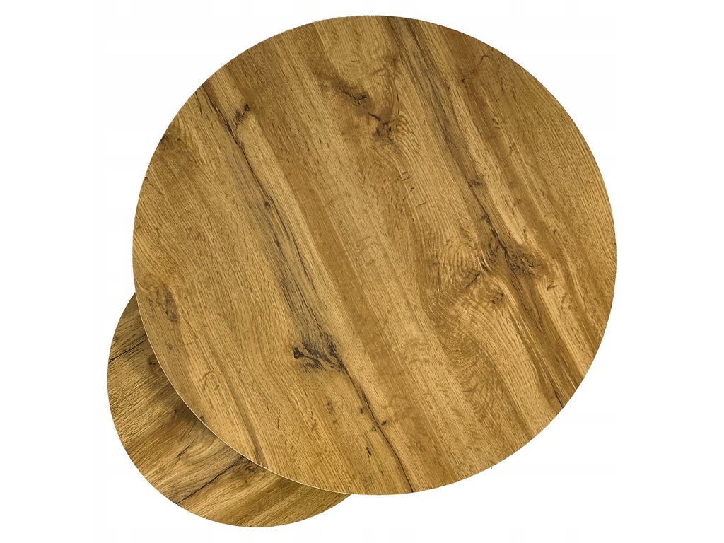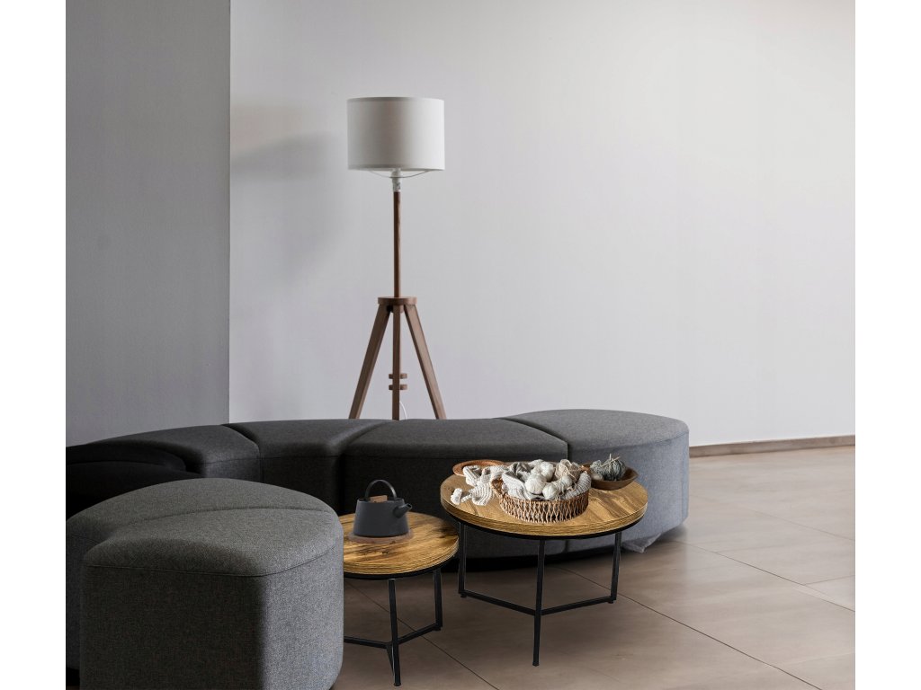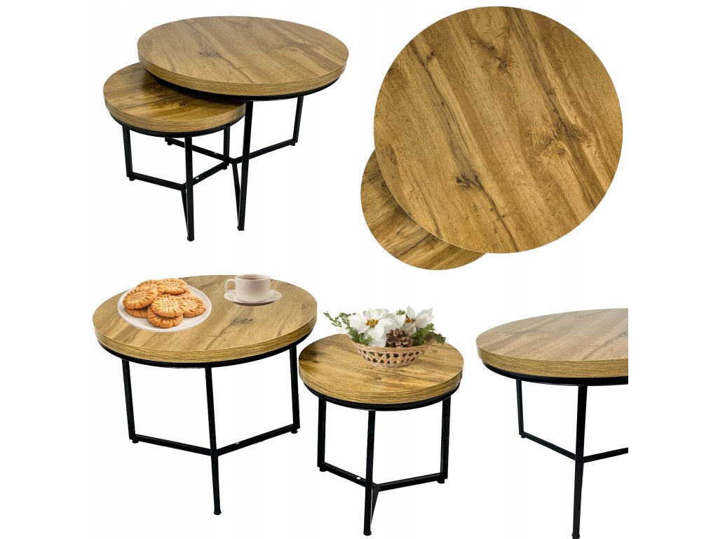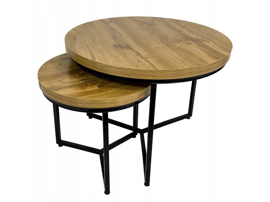 Set tvoří dva kulaté stolky s odolnou kovovou konstrukcí a dubovými deskami, které spojují syrovou eleganci industriálního stylu s teplem dřevěného dekoru. Černá ocelová konstrukce působí stabilně, pevně a dodává stolkům moderní loftový charakter.