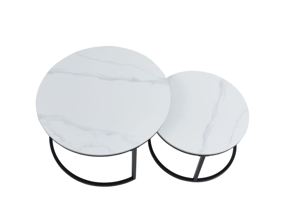 Tento elegantní set kávových stolků s mramorovým vzorem přinese do vašeho interiéru nadčasovou eleganci a praktičnost. Kombinuje bílý mramorový vzor s matnou keramickou deskou a stylové černé kovové nožičky s práškovým lakováním. Moderní design dokonale zapadne do současných i klasických obývacích prostor.