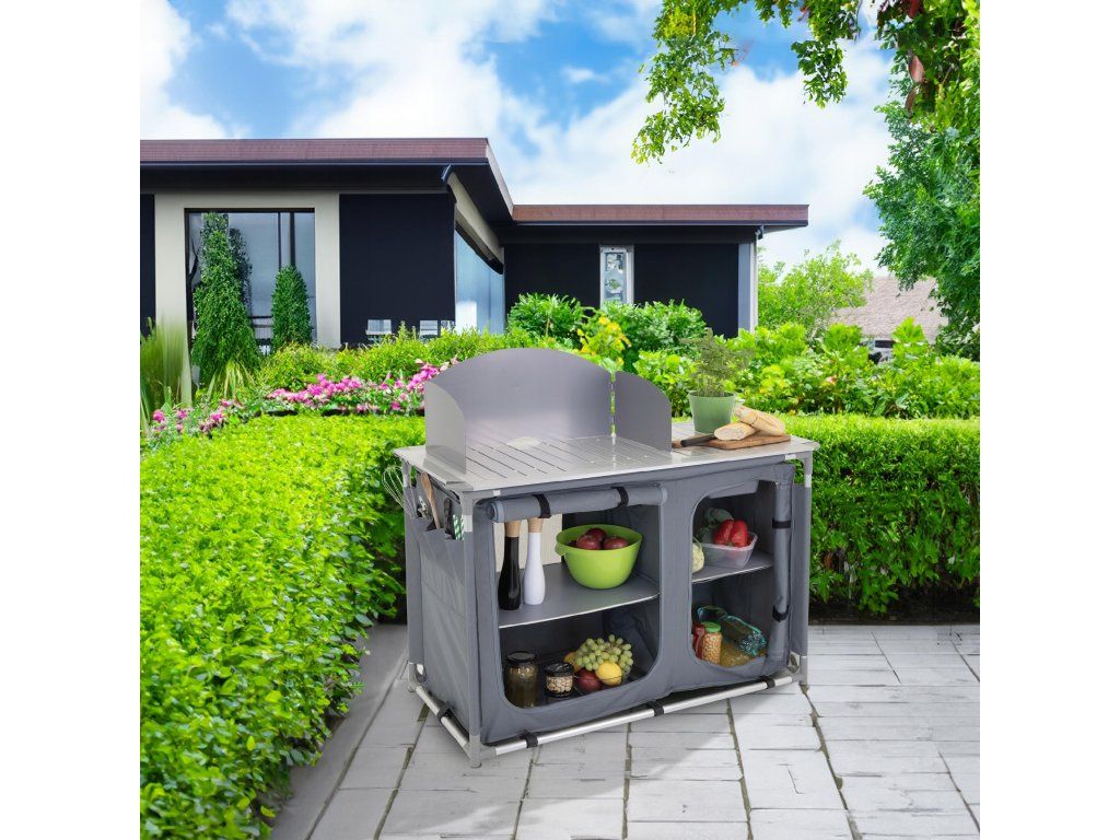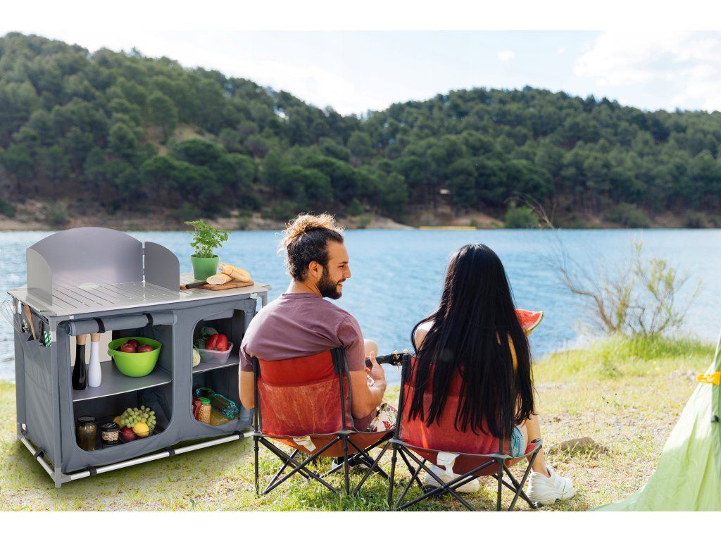 Běžné kempingové stoly slouží pouze k odložení věci, tato skládací turistická kuchyně nabízí skutečné řešení pro vaření, přípravu jídel i úschovu nádobí přímo v exteriéru.