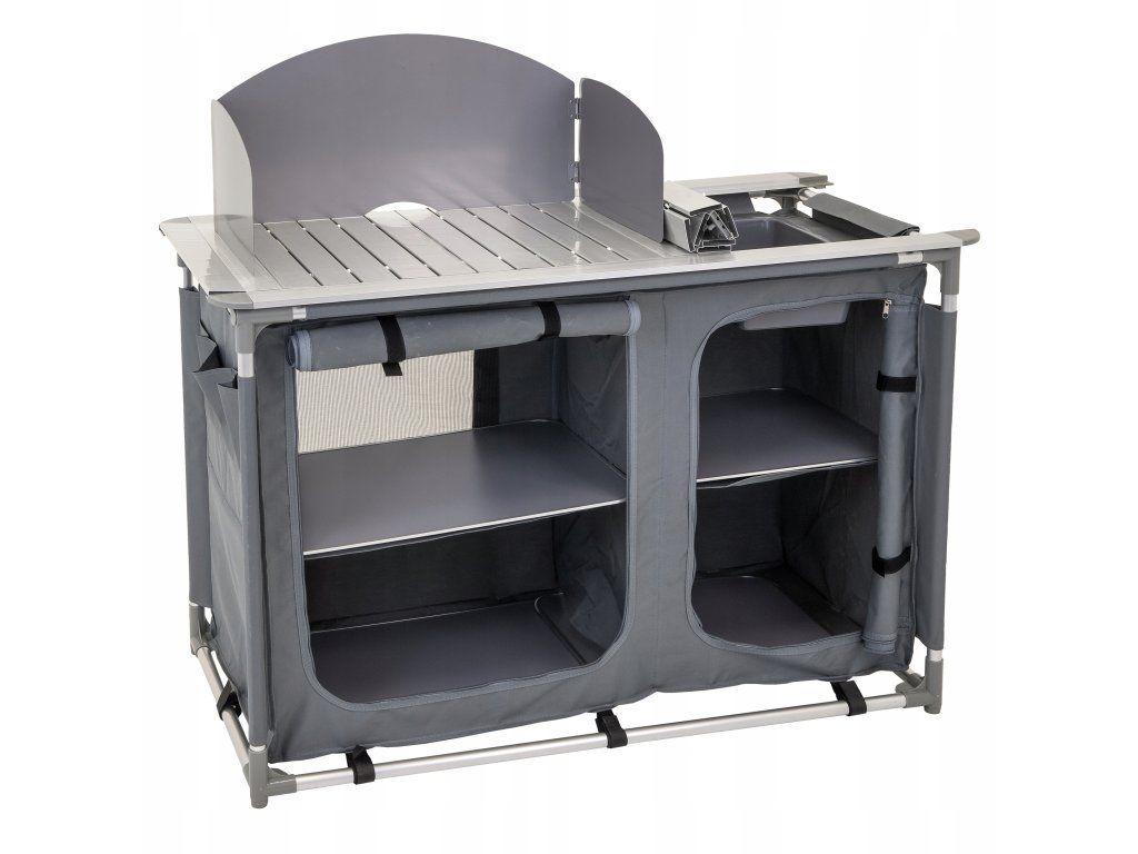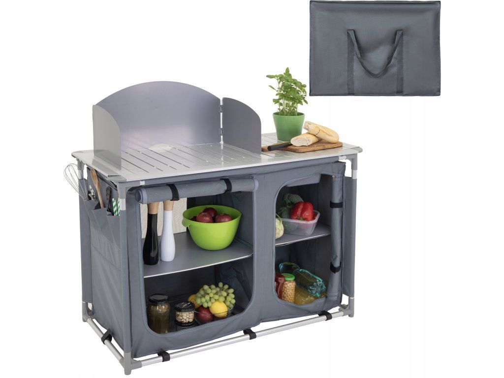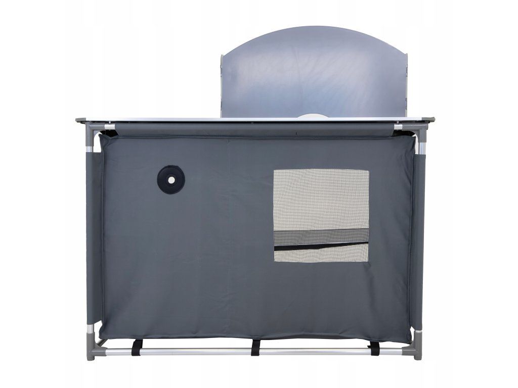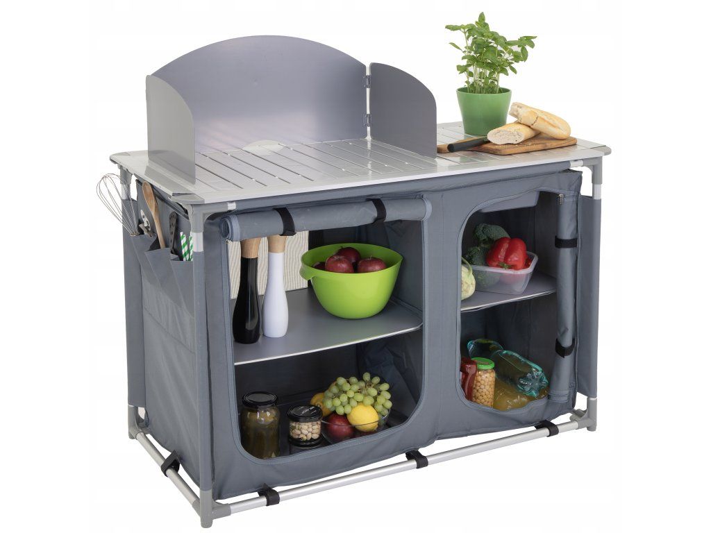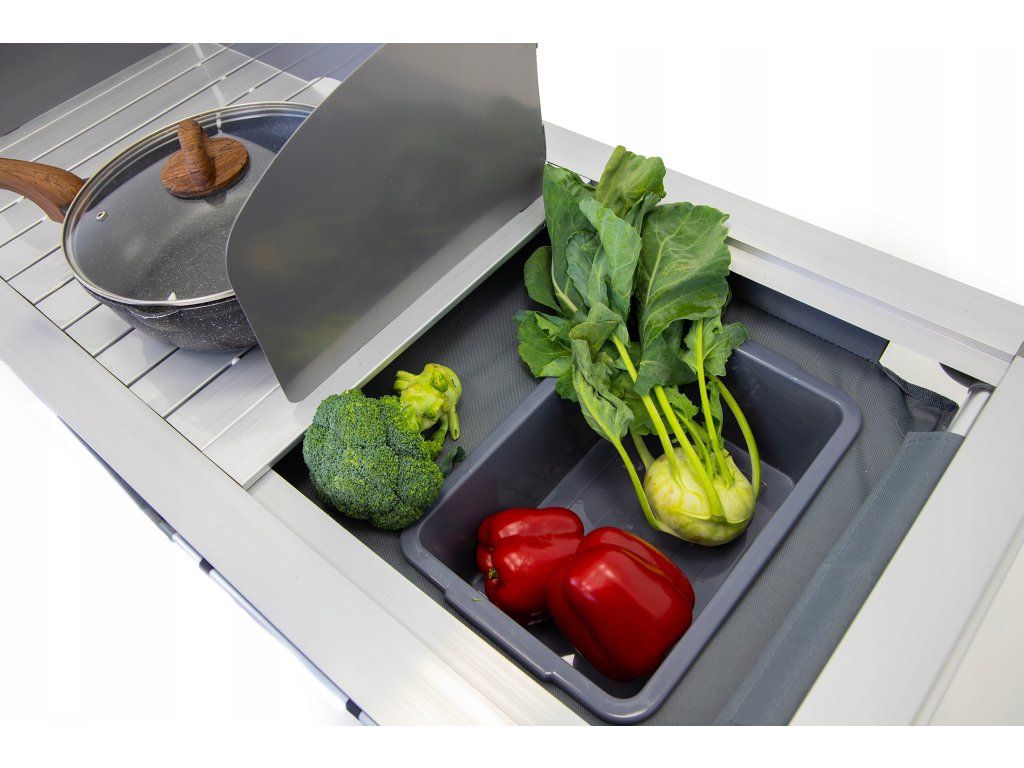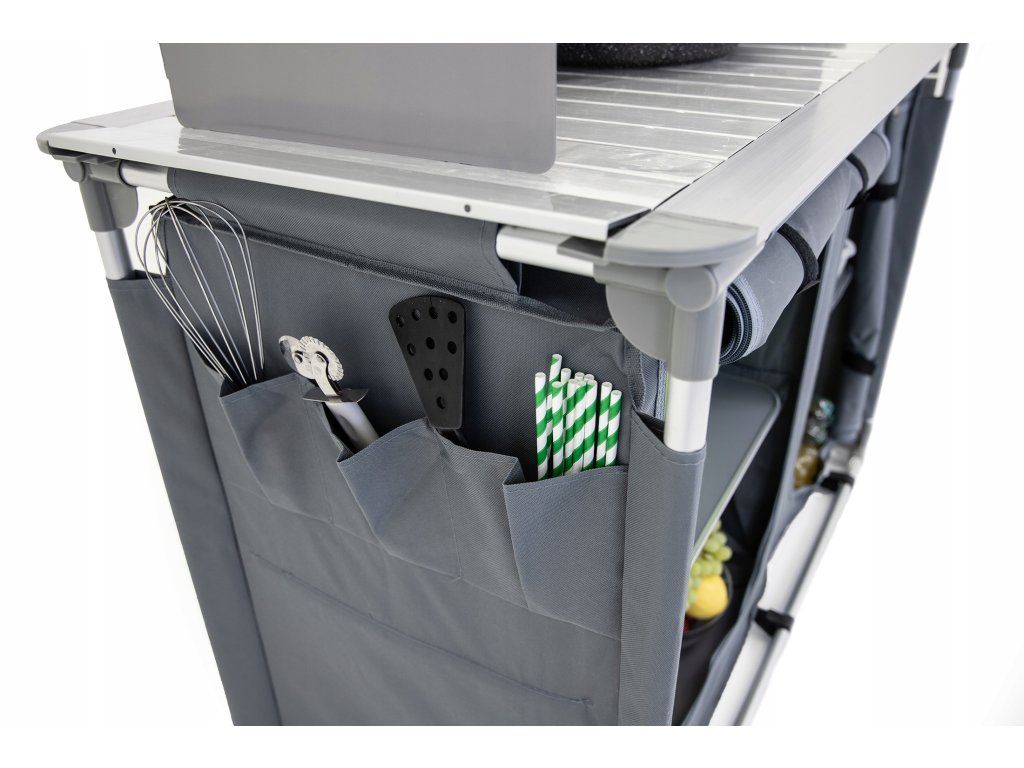 Kovová pracovní deska vydrží každodenní zatížení, srolovaná boční plocha se rozloží podle potřeby a praktická vanička pod ní slouží jako umyvadlo. Závěsná skříňka se čtyřmi zpevněnými policemi doplňuje celek o úložný prostor pro potraviny, nádoby i kempingové doplňky.