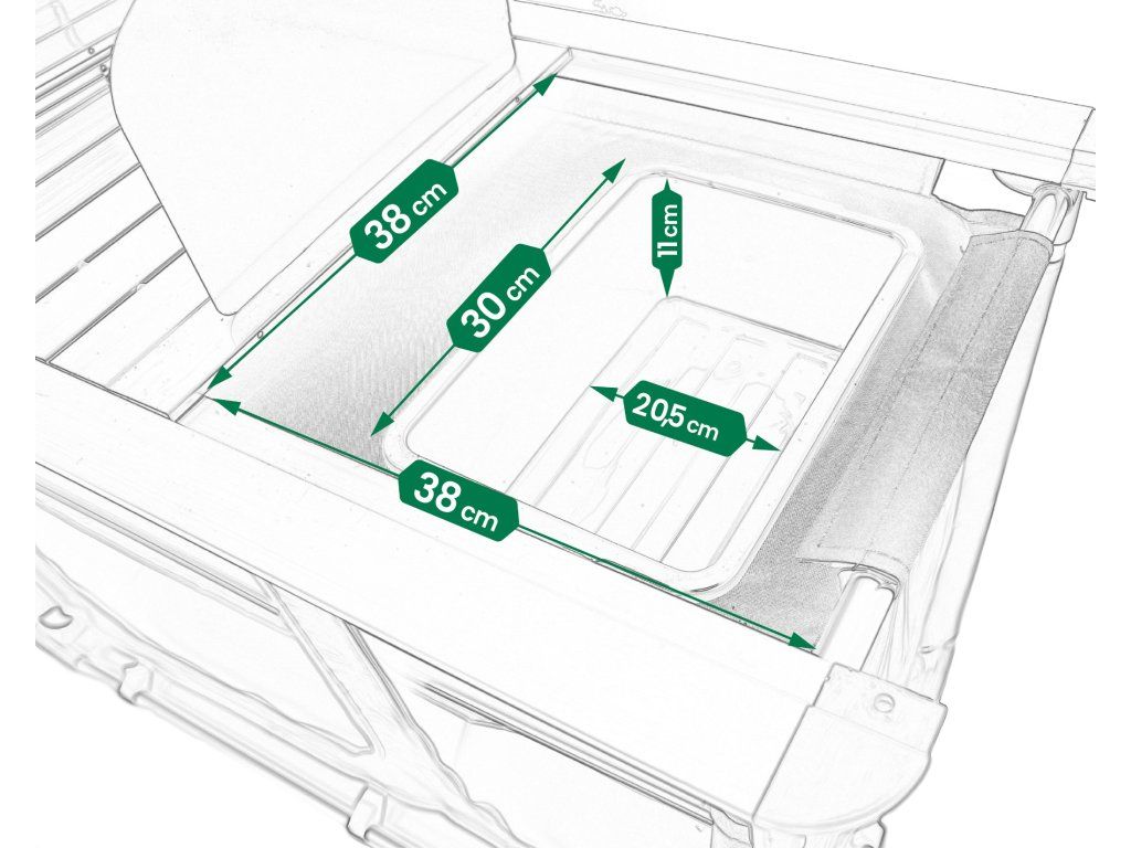 - Vanička umístěná pod boční deskou slouží jako funkční kempingové umyvadlo