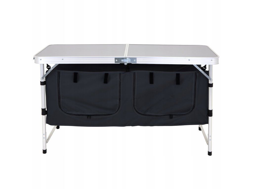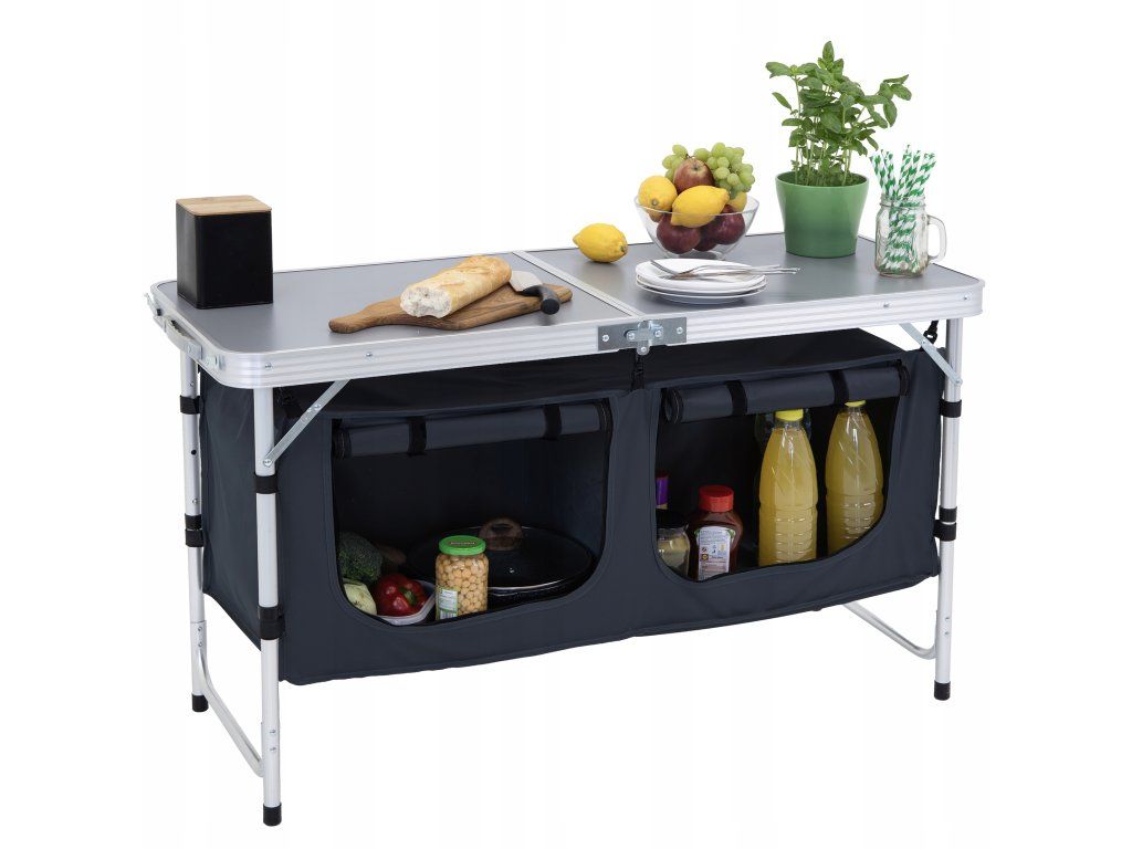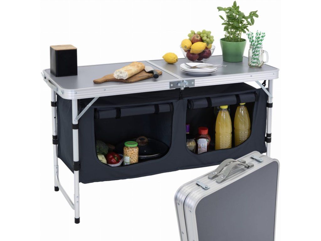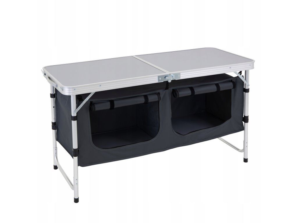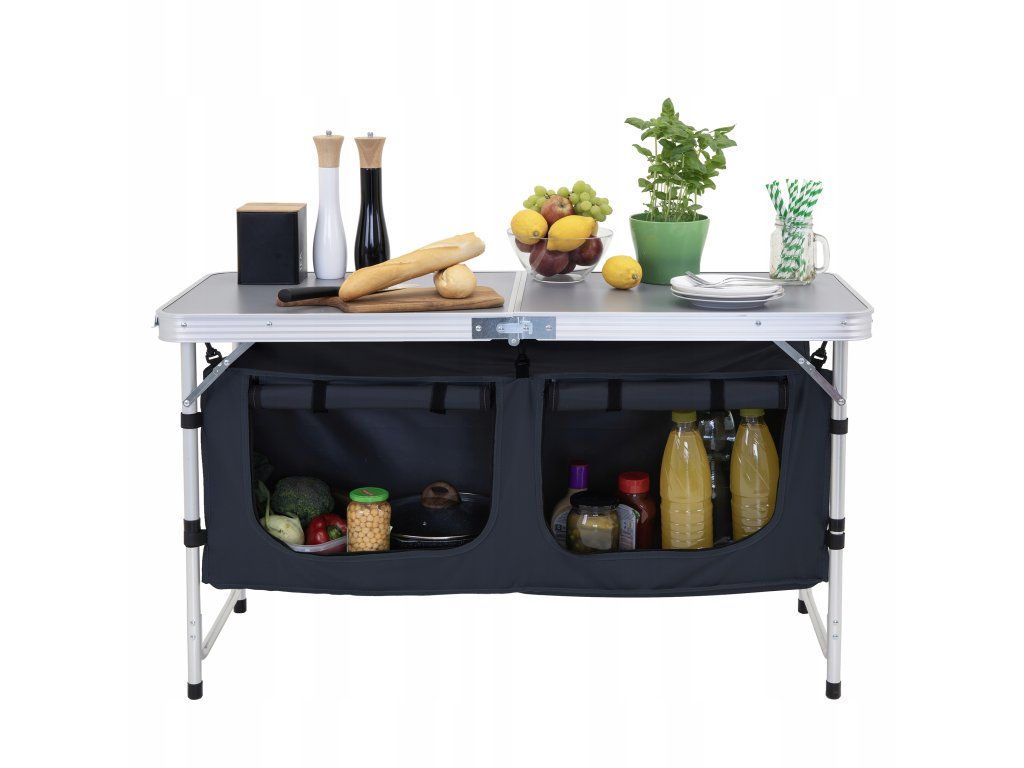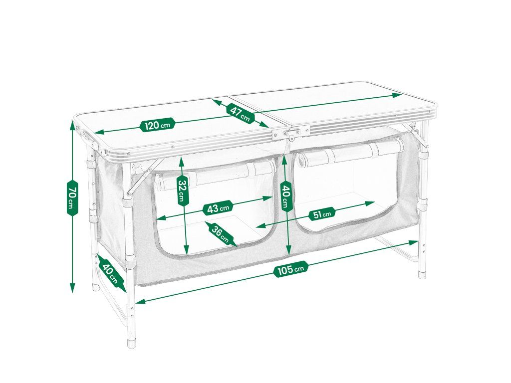 Závěsná skříňka se dvěma přihrádkami a zpevněnými policemi poskytuje dostatek prostoru pro potraviny, nádobí i další kempingové doplňky. Celá sestava se skládá do kufříkové formy, což usnadňuje přepravu i skladování mimo sezónu.