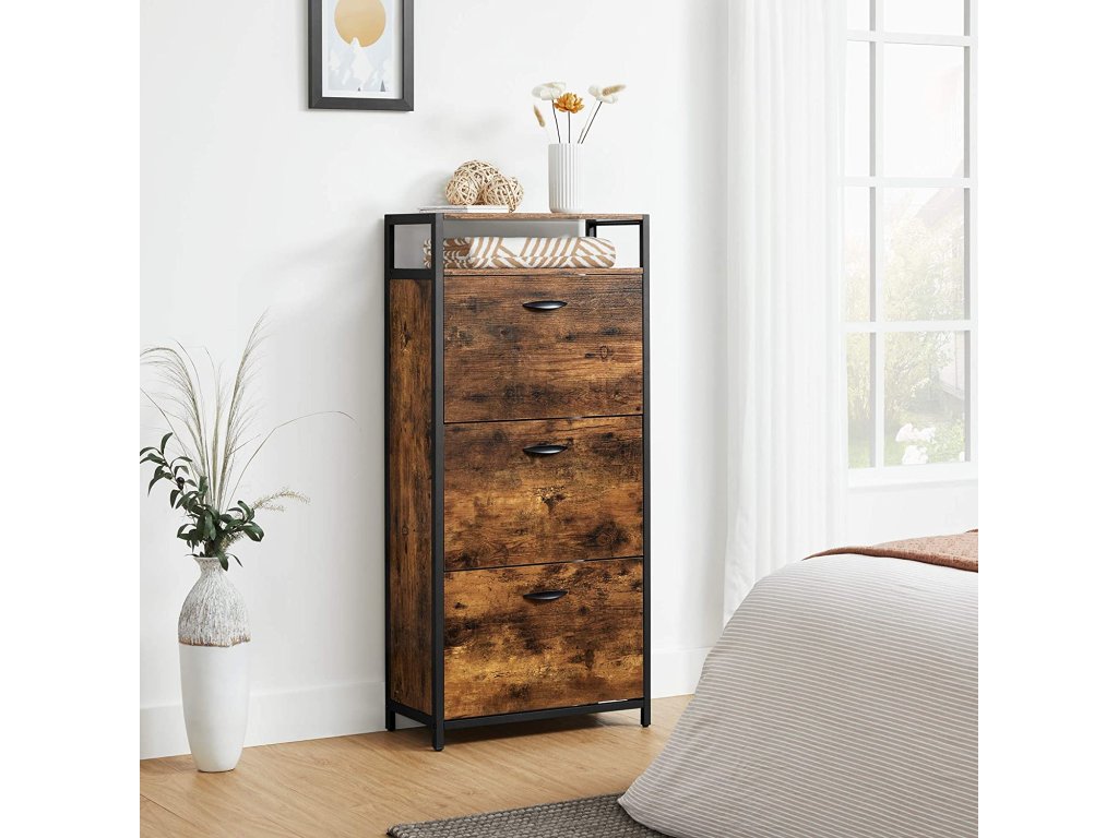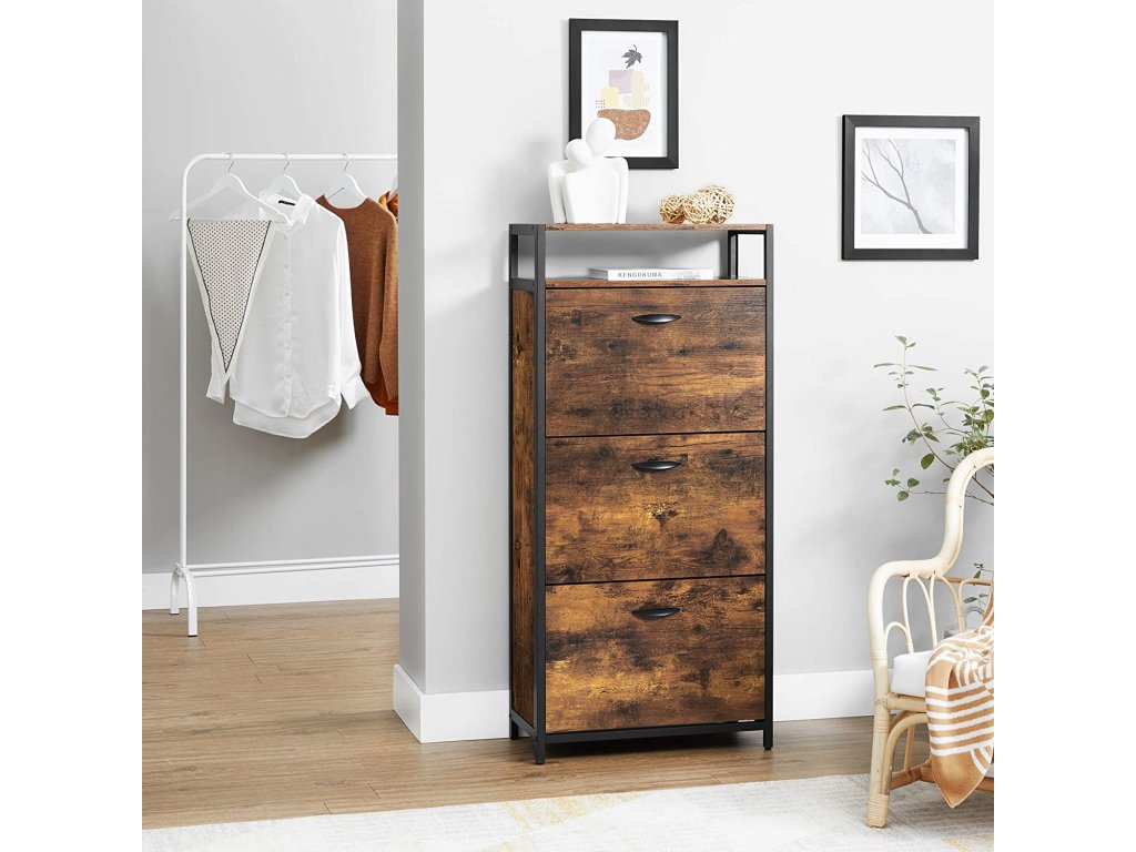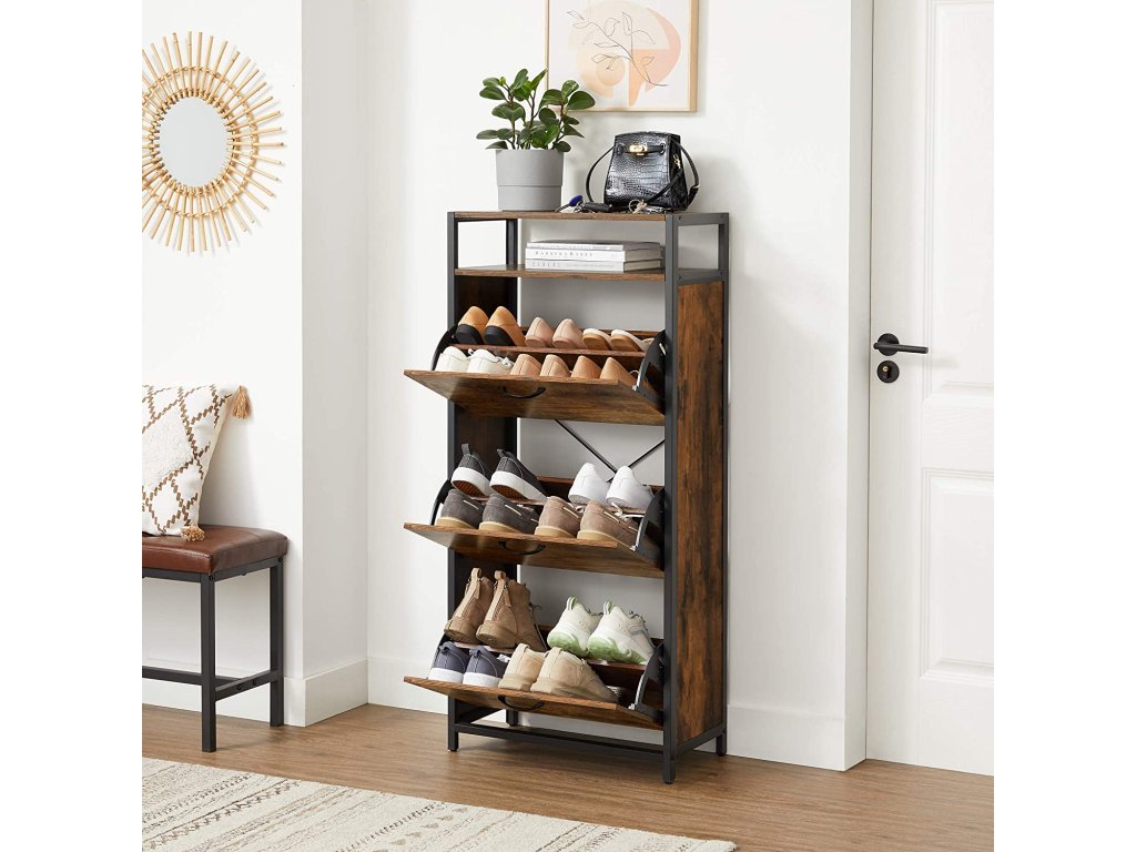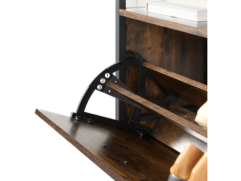 Skříňka má 3 otevírací přihrádky s celkem 6 hlubokými policemi na boty, do kterých se vejde až 18 párů bot a 2 policemi, na které můžeme umístit naše krásně zarámované fotografie, trofeje nebo ozdobné figurky a květiny v květináčích.