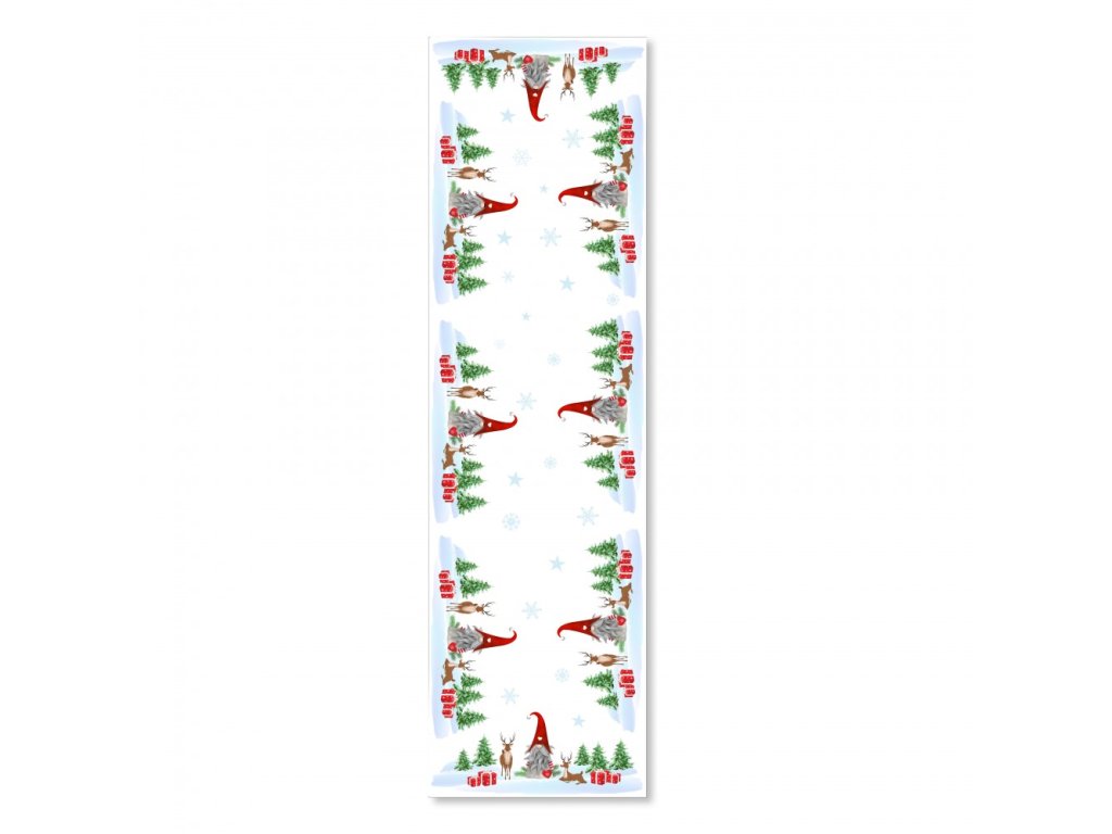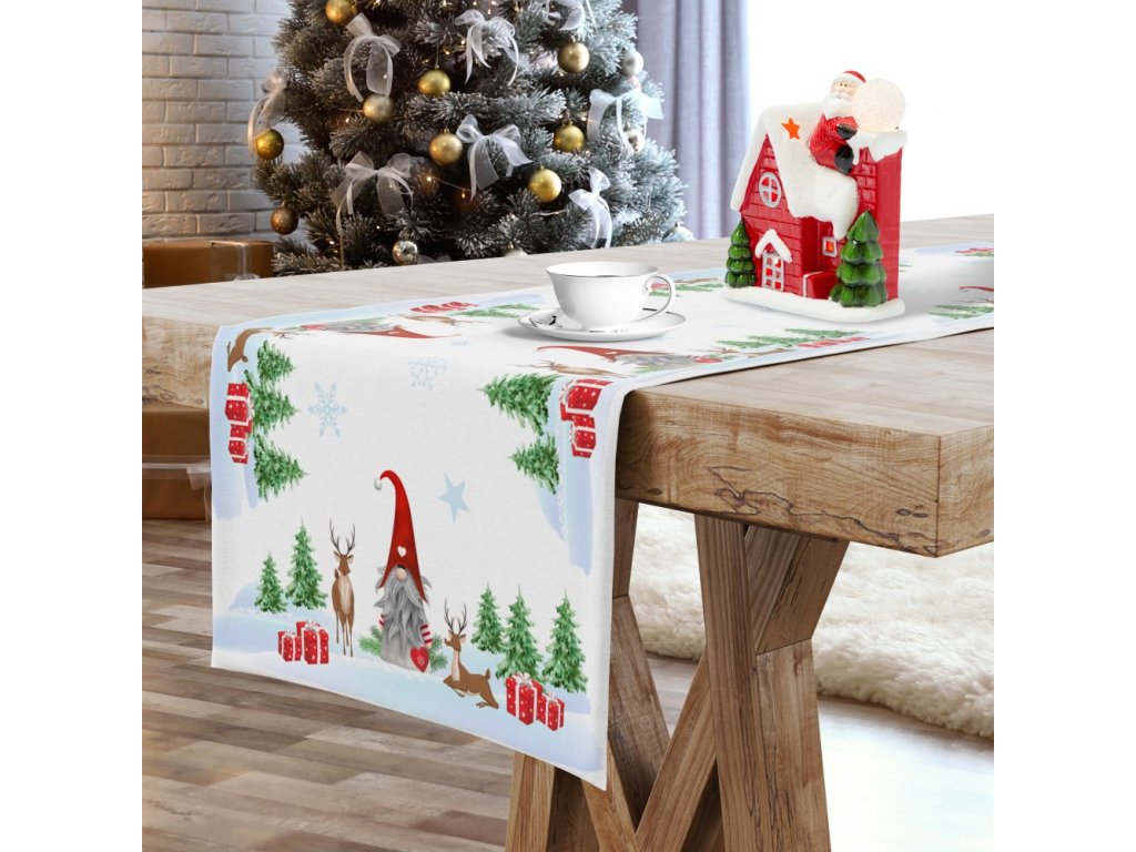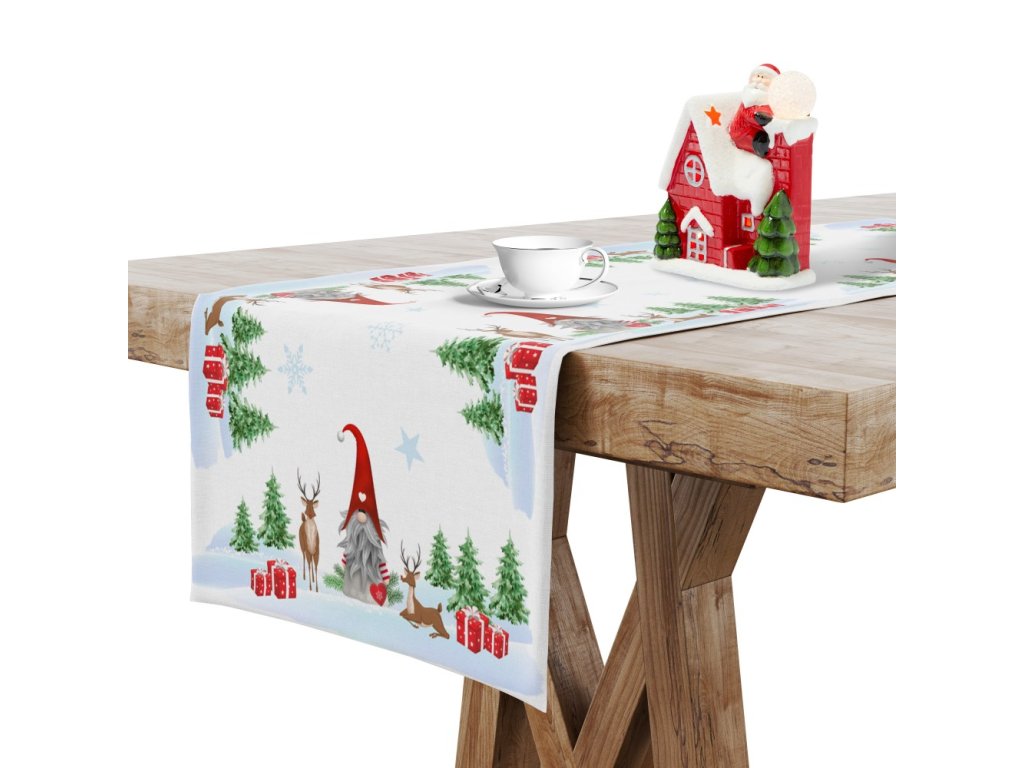 Vánoční běhoun na stůl s barevným motivem skřítka je jedinečnou vánoční dekorací. Barevný vzor trpaslíků, sněhových vloček či vánočních stromků je naaranžován tak, aby nepřehlušil, ale v každém probudil sváteční atmosféru.