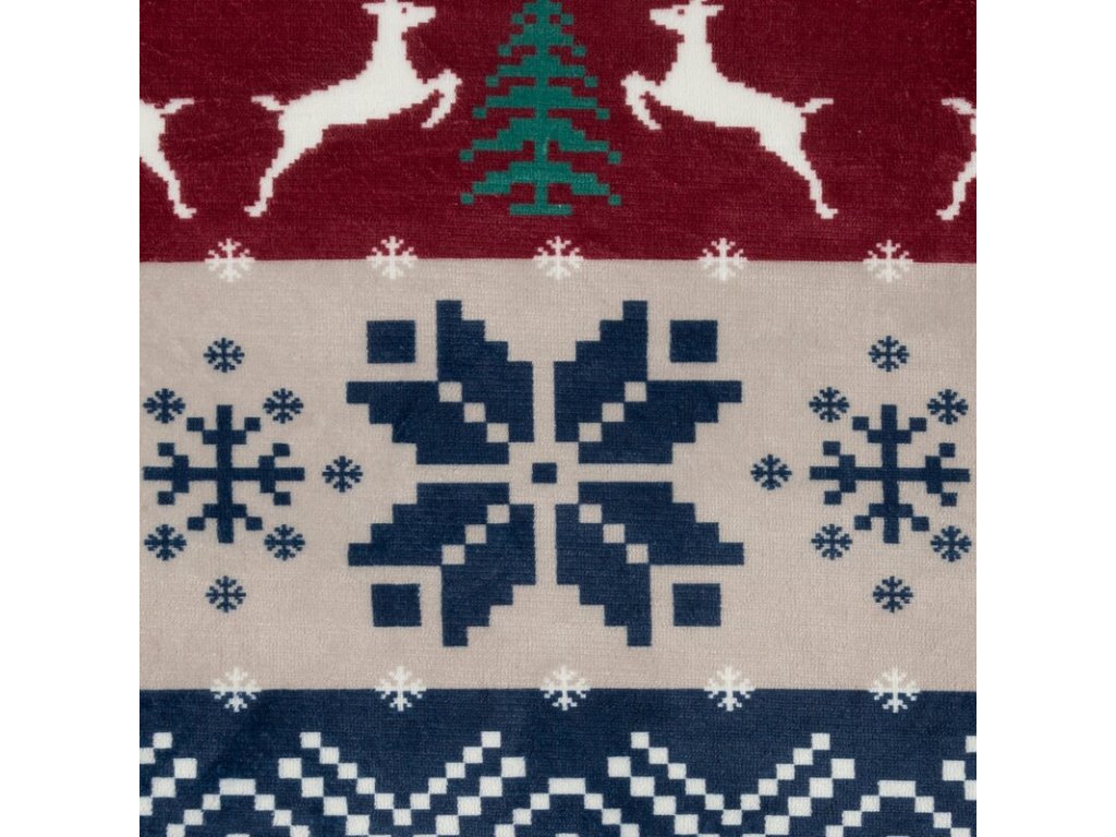 Tradiční vzor se sněhovými vločkami, sobíky a zimními motivy v červeno-modro-bílých odstínech navodí pravou vánoční atmosféru a skvěle doladí váš interiér k vánočnímu stromku.