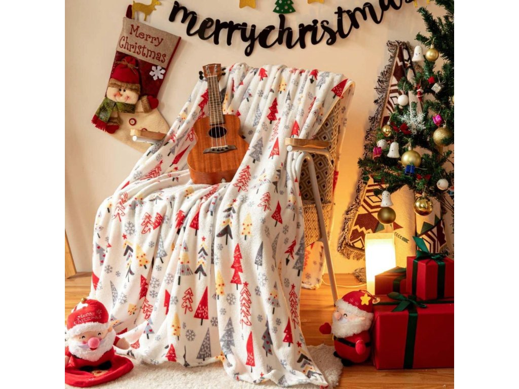 Zpříjemněte si zimní večery s touto měkoučkou vánoční dekoru z mikrovlákna v bílé barvě, zdobenou veselými stromky v červeno šedých odstínech.
