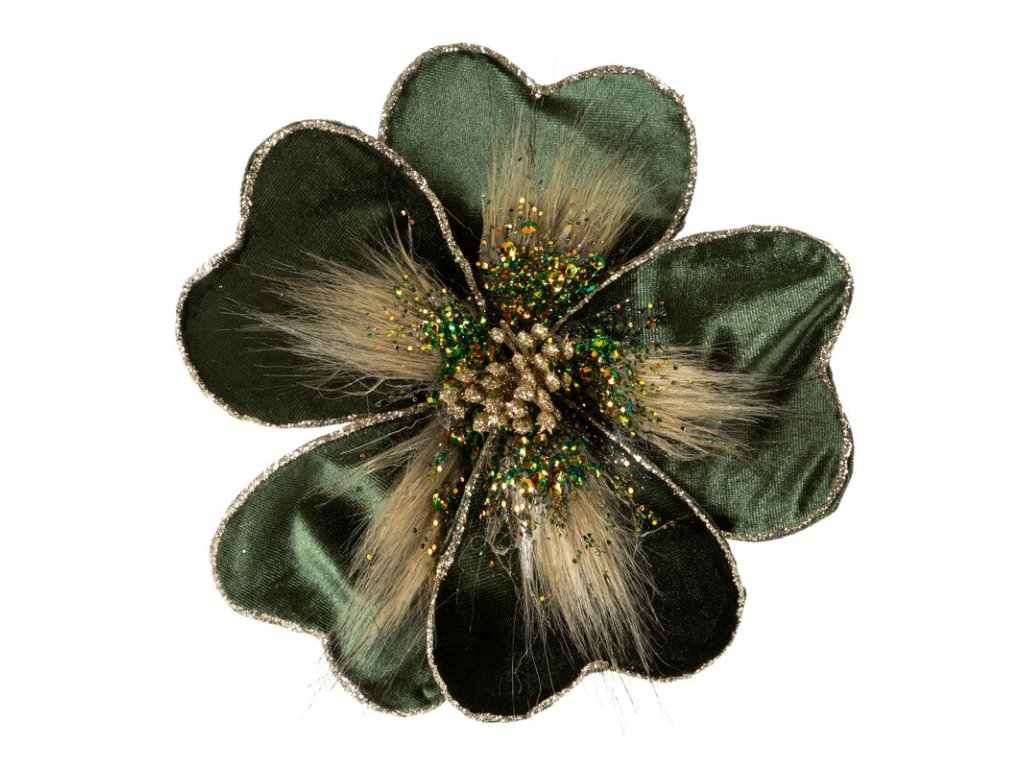 Vánoční dekorační květ 172 s kožíškem v tmavě zelené barvě - sada 12 kusů