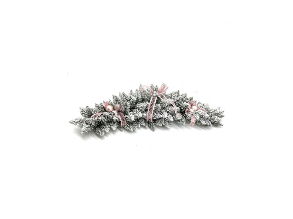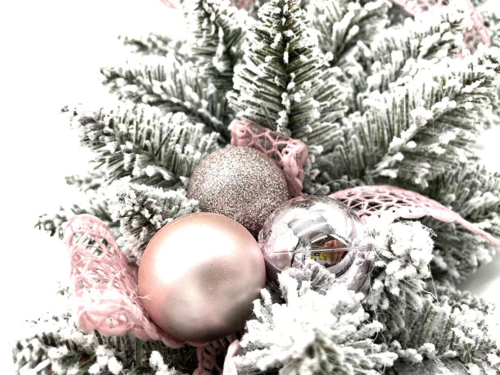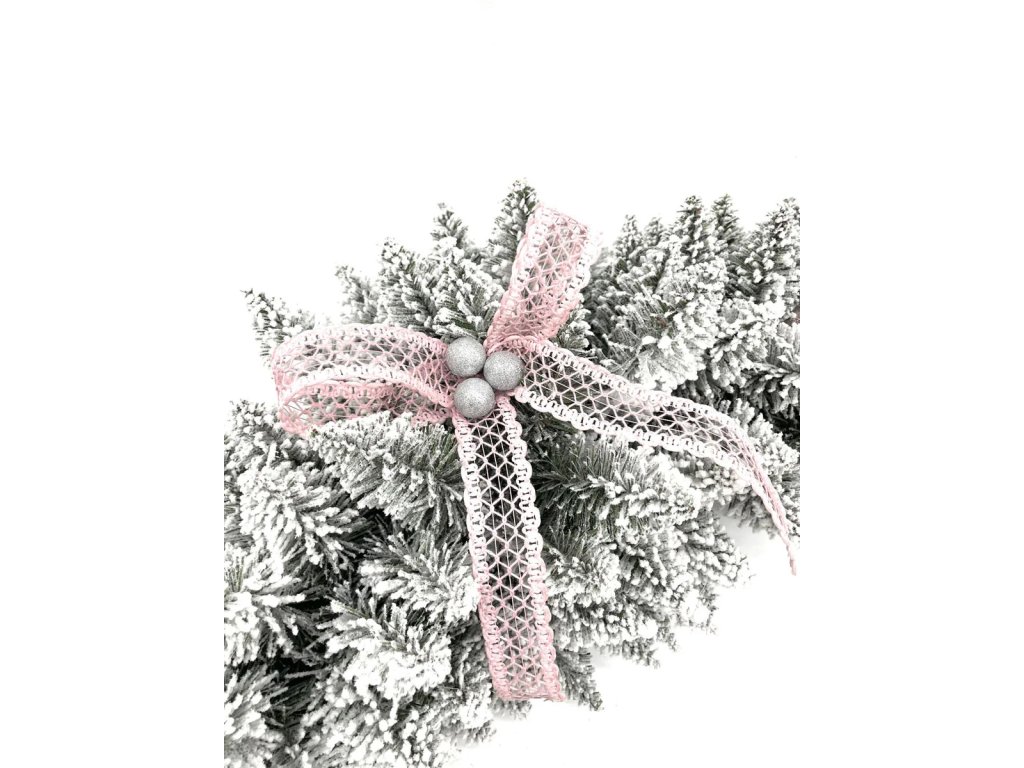 Vánoční girlanda zasněžená umělým sněhem v pudrově růžové barvě je zdobena vánočními ozdobami a mašličkami ve stejné barvě.