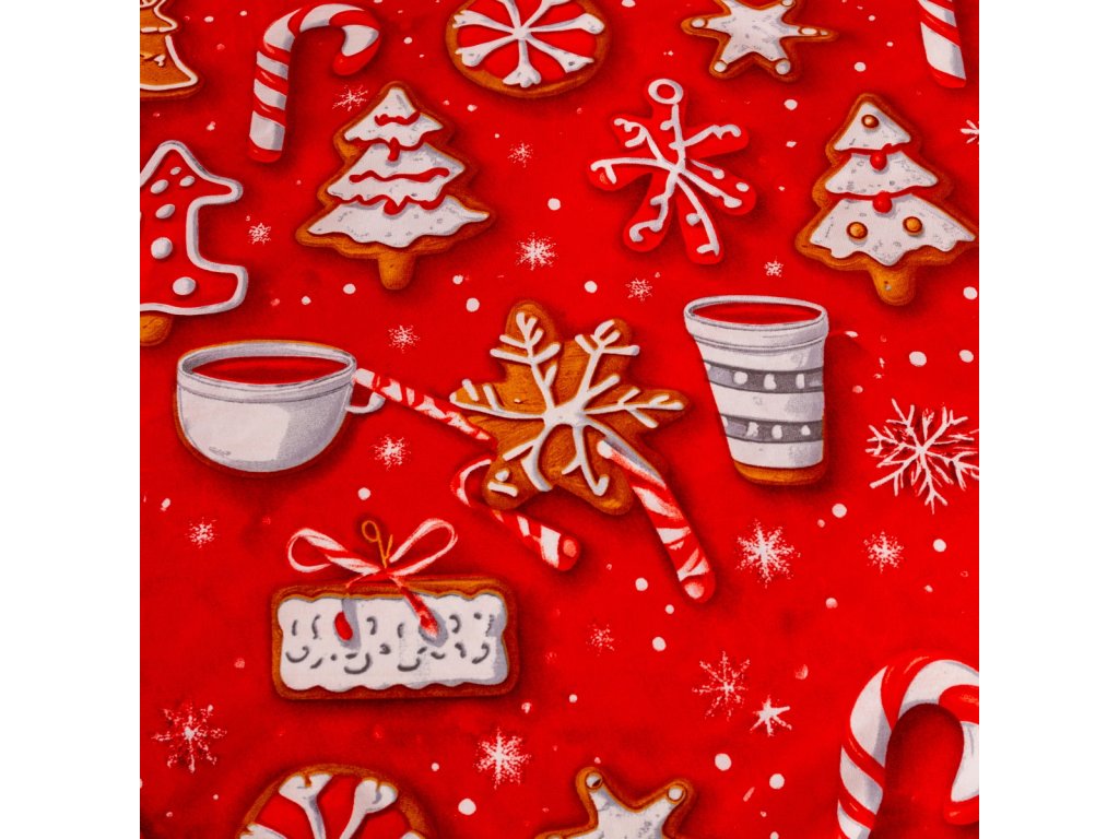 Sváteční vzor s bíle ozdobenými perníčky na sytě červeném pozadí vytváří působivou a veselou kompozici.