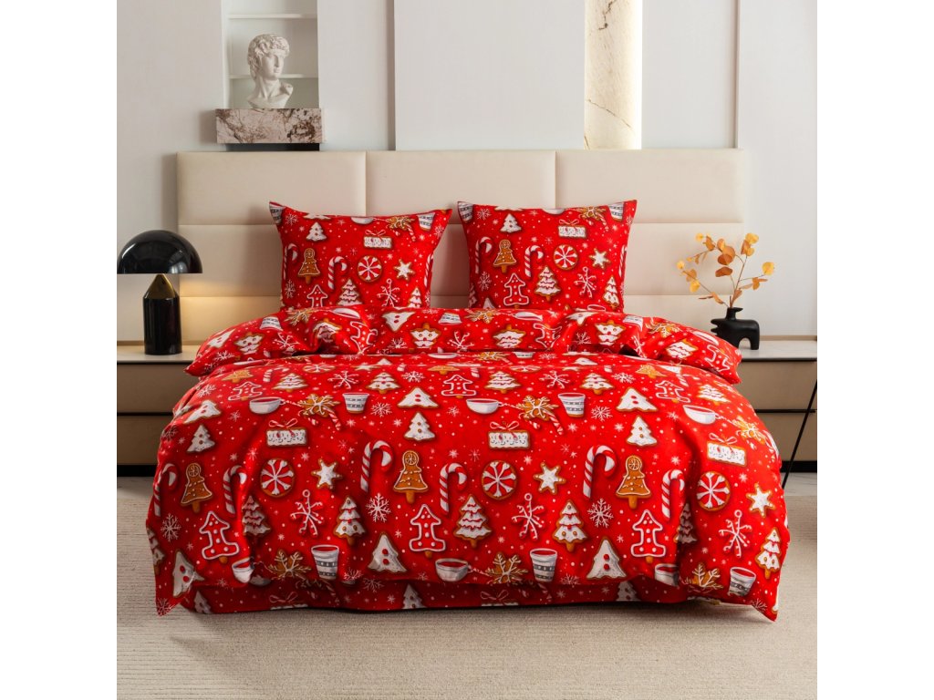 Charakteristická barevná scéna založená na červené barvě s bílými akcenty krásně zdůrazňuje zimní charakter a přináší do ložnice teplo a útulnost.