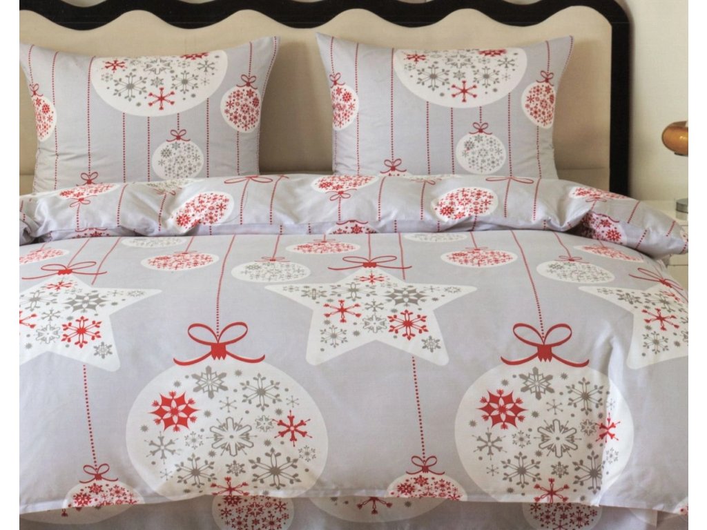 Vánoční ložní povlečení ze syntetické bavlny, zdobené potiskem vánočních ozdob na šedém podkladu.