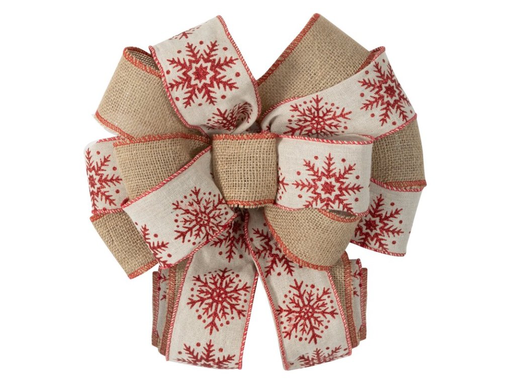 Ekologická dekorace na vánoční stromek - vánoční mašle z přírodní juty zdobená potiskem sněhových vloček v červené barvě se stane ozdobou vašeho vánočního stromku.