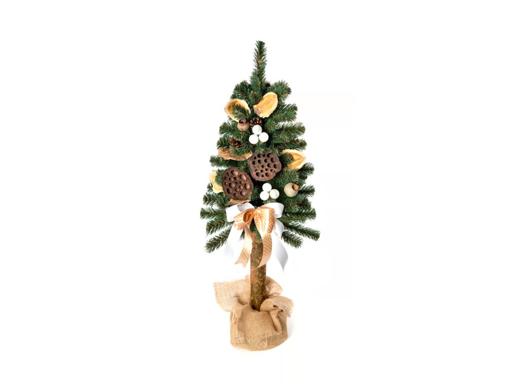Zelený stromek evokuje zimní pohádkové scenérie, ozdobná mašle v meruňkové a bílé barvě dodává jemný, sofistikovaný nádech, dozdobený sušenými, přírodními ozdobami.