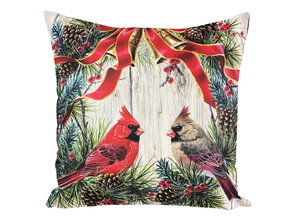 Sametové dekorační povlečení na polštář s krásným vánočním potiskem zobrazujícím dva kardinály obklopené borovými větvičkami, šiškami a červenými bobulemi.