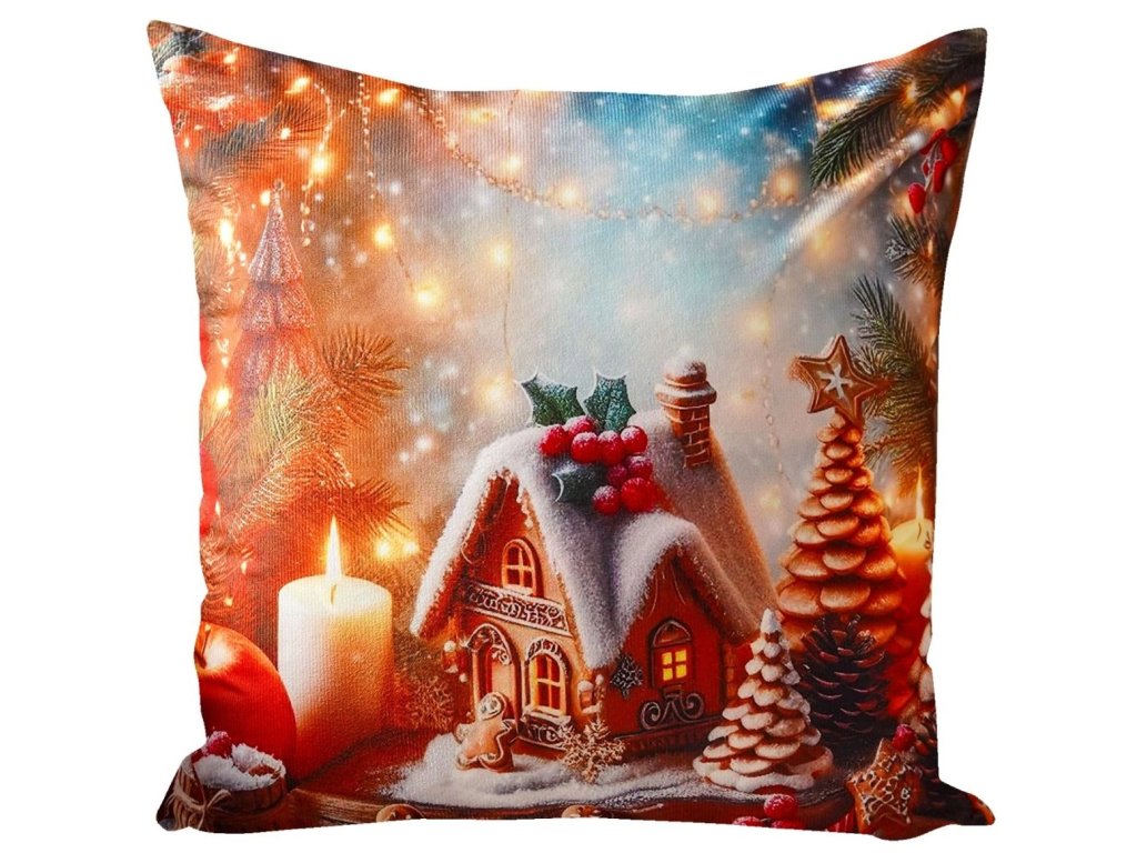 Dekorační povlak na polštář z měkkého sametu s motivem zasněženého perníkového domku obklopeného vánočním stromečkem, svíčkou a svátečními dekoracemi.