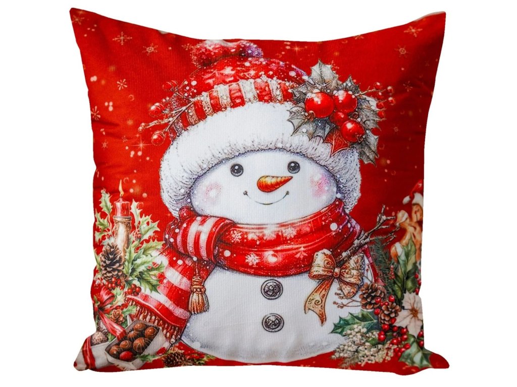 Sváteční, velurový povlak na polštář s jemnou sametovou texturou s veselým sněhulákem v červené čepici a šálu na pozadí syté červené barvy.