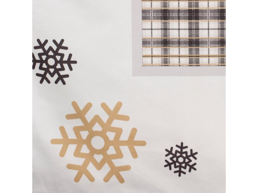 Je zdoben potiskem sněhových vloček a károvaného vzoru.