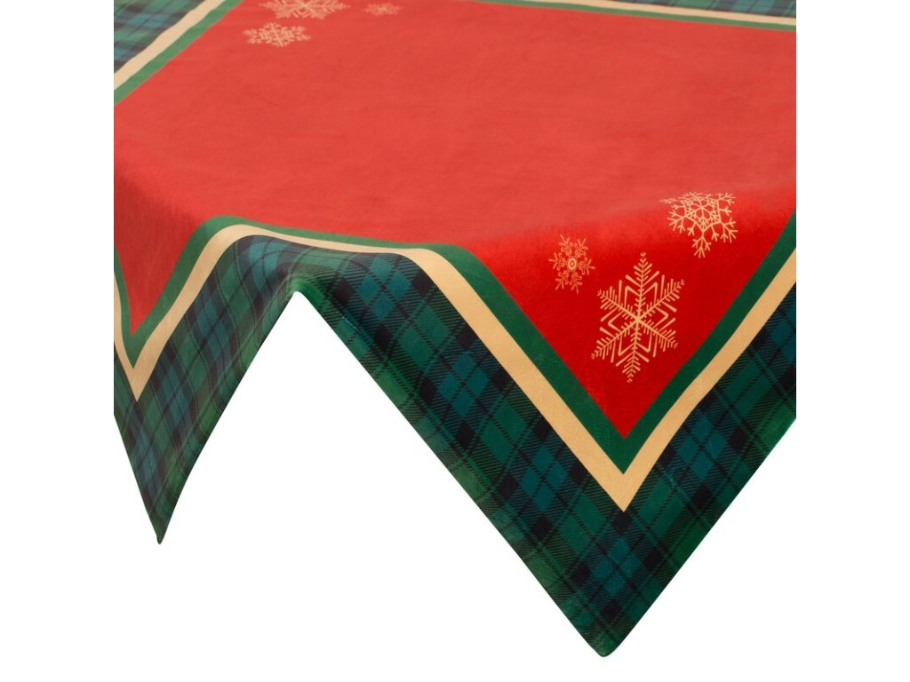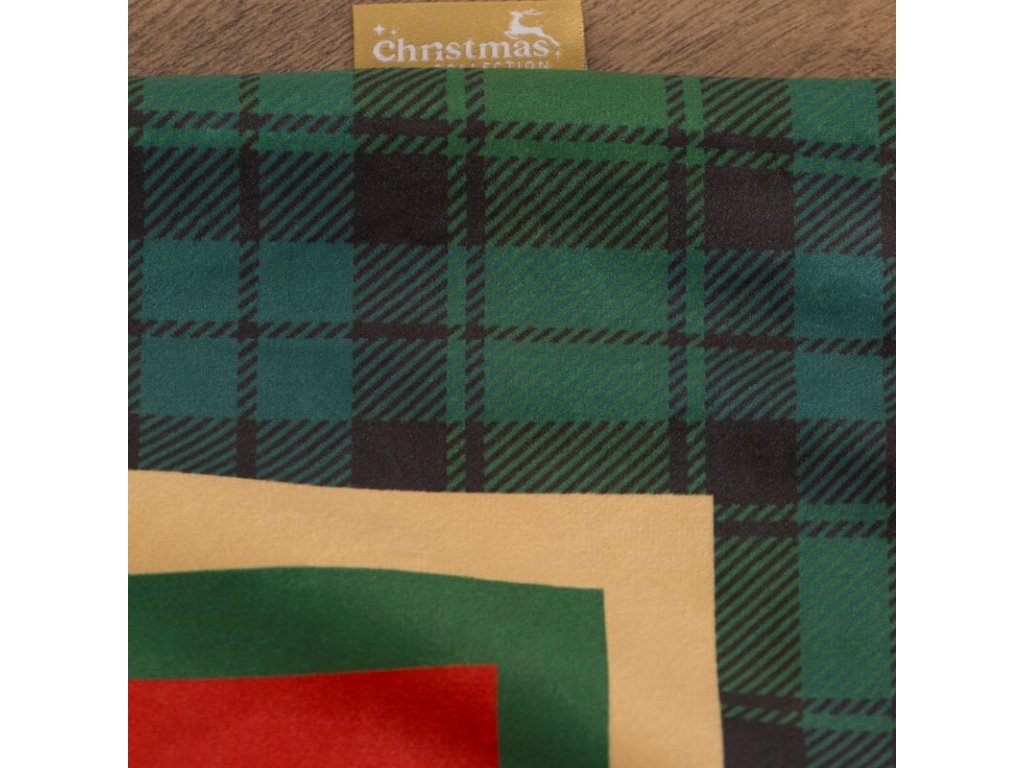 Sametový dekorační ubrus na stůl s vánočním motivem v červené barvě.