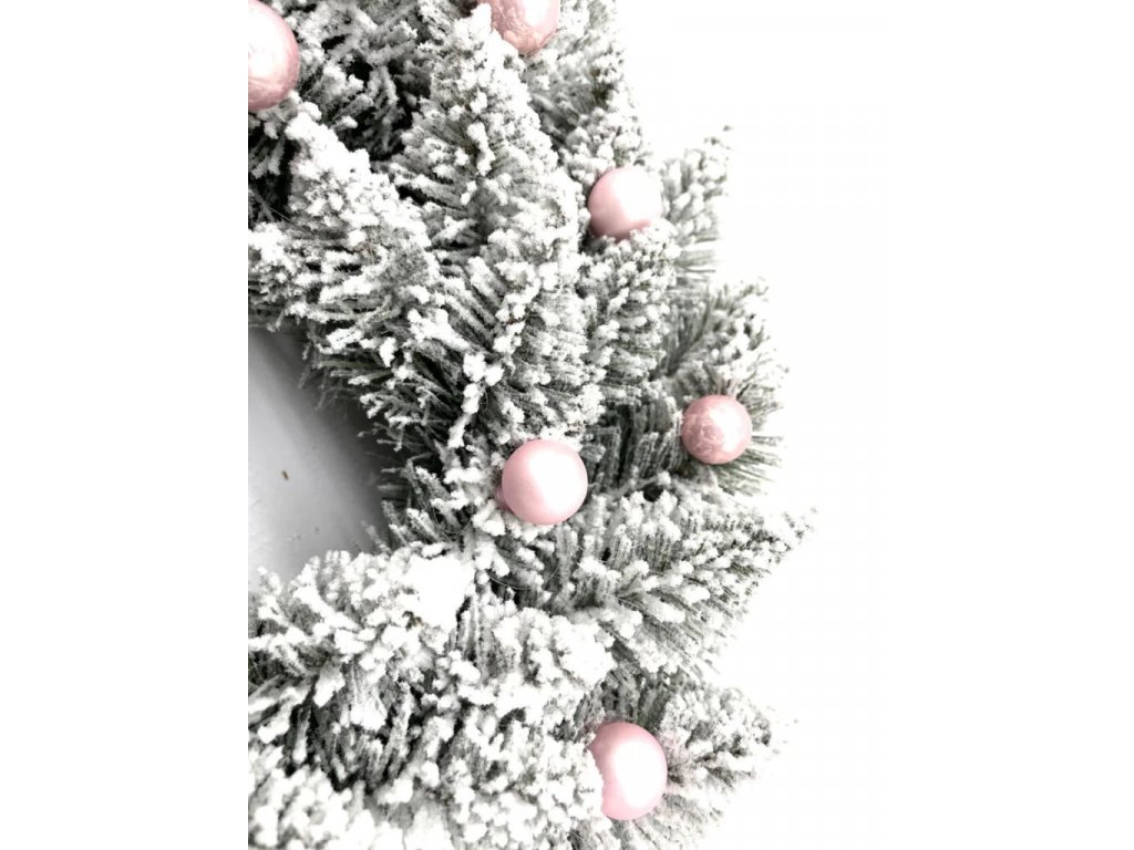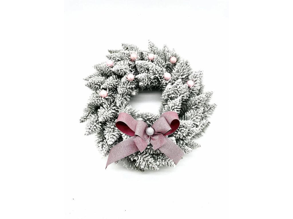 Vánoční věnec zasněžený umělým sněhem zdobený mašlí v pudrově růžové barvě a perličkami.