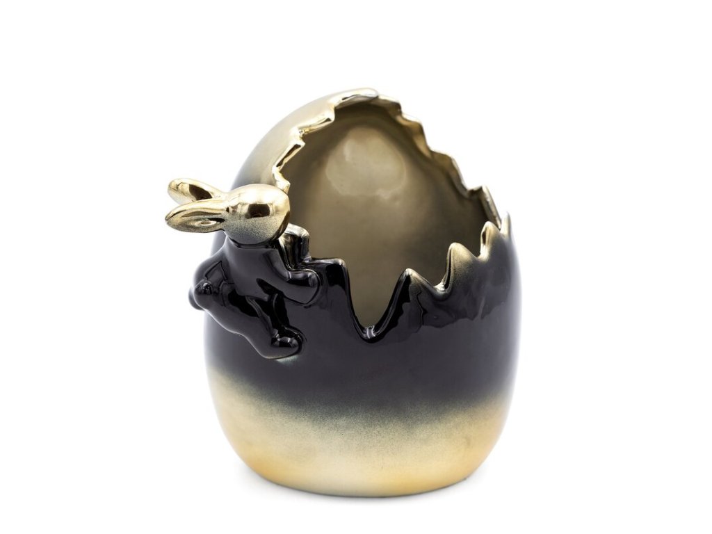 Tato impozantní velikonoční figurka vajíčka se zajíčkem v černo-zlaté barvě představuje dokonalý doplněk pro náročné. Vyrobená z výběrové keramické hlíny, vyniká svojí pevnou konstrukcí a luxusním ombre povrchem.