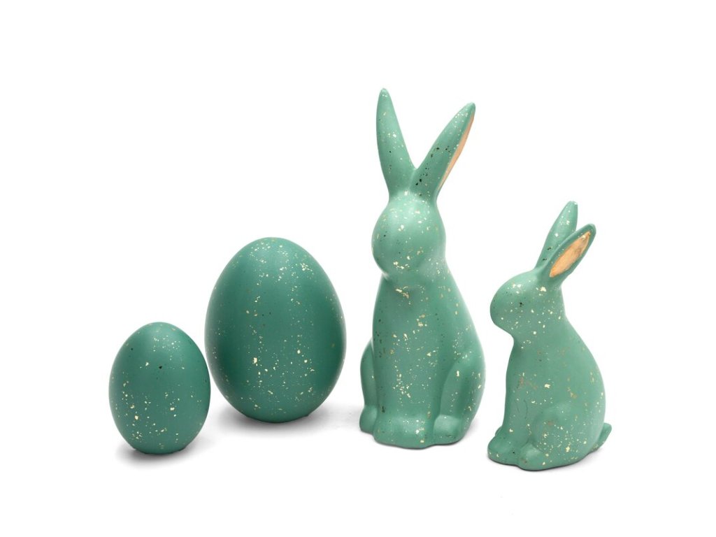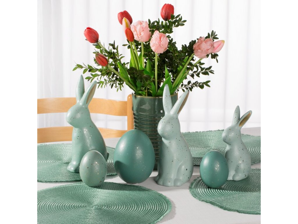 Stylová a elegantní velikonoční figurka ve tvaru vajíčka vyrobená z kvalitní keramické hlíny. Její jedinečný design podtrhuje výrazné zdobení v tmavě tyrkysové barvě.