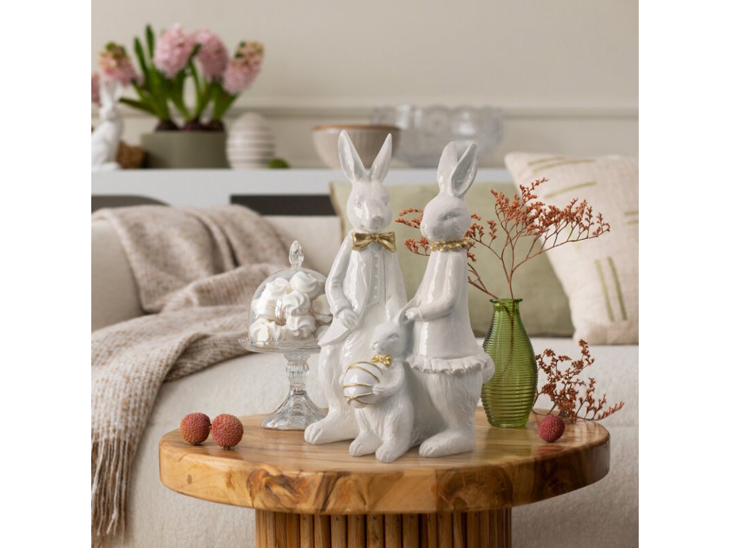 Oživte svou velikonoční výzdobu touto majestátní figurkou zajíčků, které jsou ztělesněním elegance. Vyrobeno z poctivé keramické hlíny, vyniká svou pevnou konstrukcí a jemným krémovým provedením. Svou impozantní výškou 32 cm dominuje každému aranžmá a okamžitě upoutá pozornost v každém interiéru.
