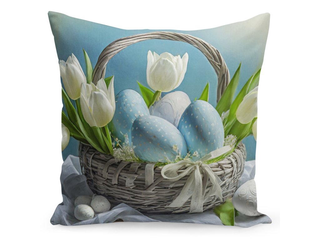Táto obliečka predstavuje klasickú veľkonočnú kompozíciu - veľkonočné vajíčka s bielymi tulipánmi v prútenom košíku.