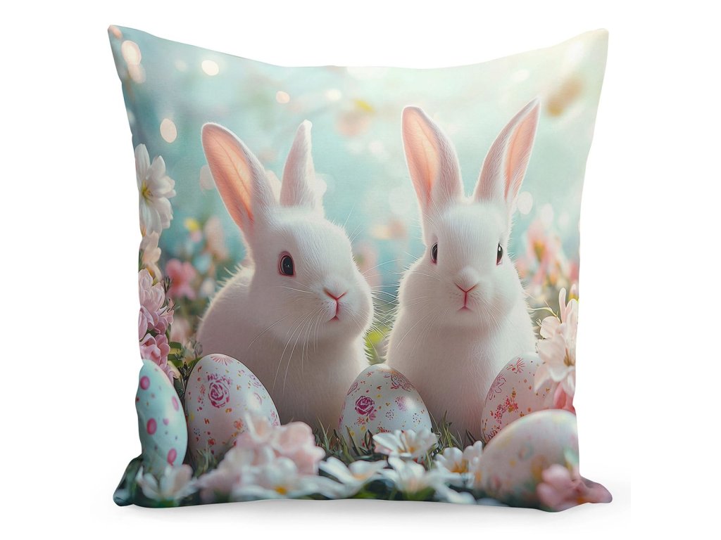 Toto velikonoční povlečení na polštář okouzlí něžným a hravým motivem dvou bílých zajíčků obklopených pastelovými velikonočními vajíčky a jarními květy.