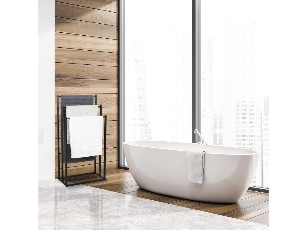 Praktický a elegantní volně stojící věšák na ručníky je ideálním řešením pro každou koupelnu, prádelnu či wellness prostor. Díky tříramenné konstrukci umožňuje přehledné zavěšení více ručníků najednou, čímž podporuje jejich rychlejší schnutí a udržuje pořádek v interiéru.