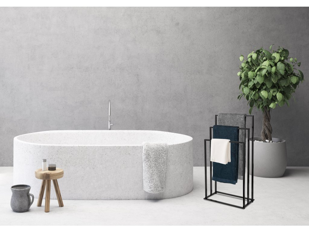 Díky protiskluzovým ochranným nožičkám stojan pevně stojí i na hladkých koupelnových dlaždicích. Je lehký, snadno se přenáší a svým minimalistickým designem zapadne do loftového, industriálního nebo skandinávského interiéru .
